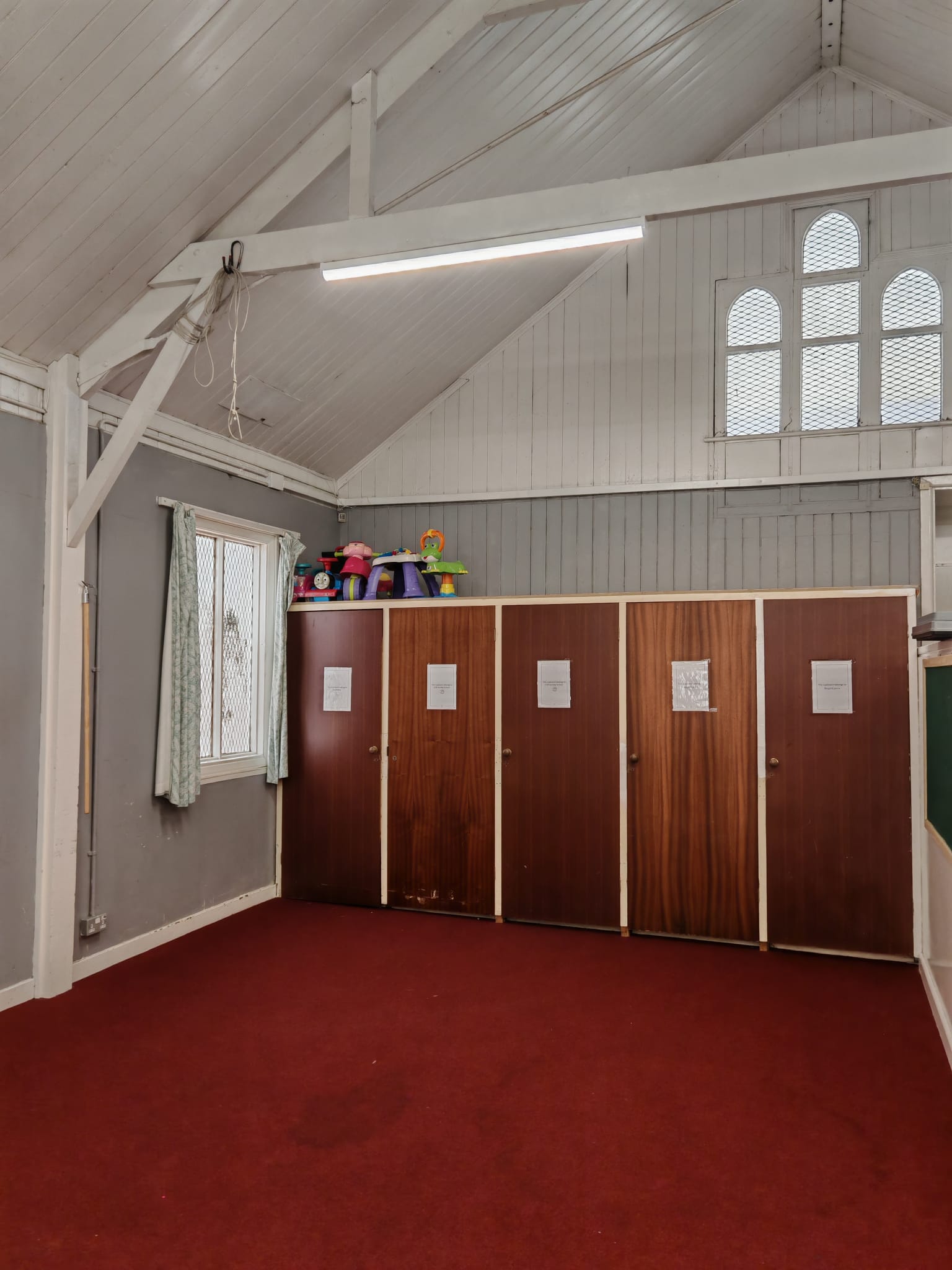 The main floor – the newly lino covered part - is 9 metres from entrance door to start of the carpeted area, and 7 metres 35 cm wide; and a further but narrower 1 metres 92 cm area carpeted where it is only 4 metres wide before you reach the main carpeted area which is a further 3 metres to the end, and just 4 metres wide, therefore a total of 4 metres 92 cm length of this narrower 4 metres wide bit next to the stairs & disabled lift.